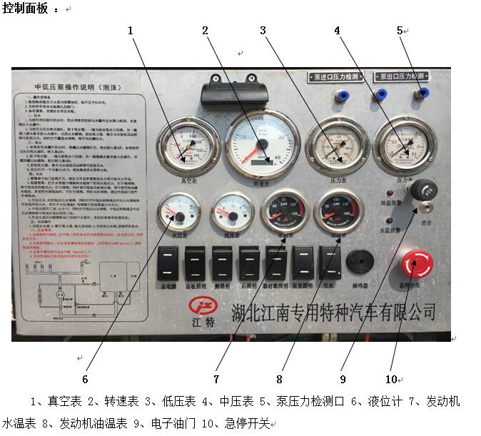 (1) 真空壓力表:用來(lái)指示泵內(nèi)真空度;在使用消防車(chē)抽水時(shí)必須先抽真空,否則里面有空氣會(huì)造成水抽不上來(lái)的現(xiàn)象,沒(méi)有壓力;